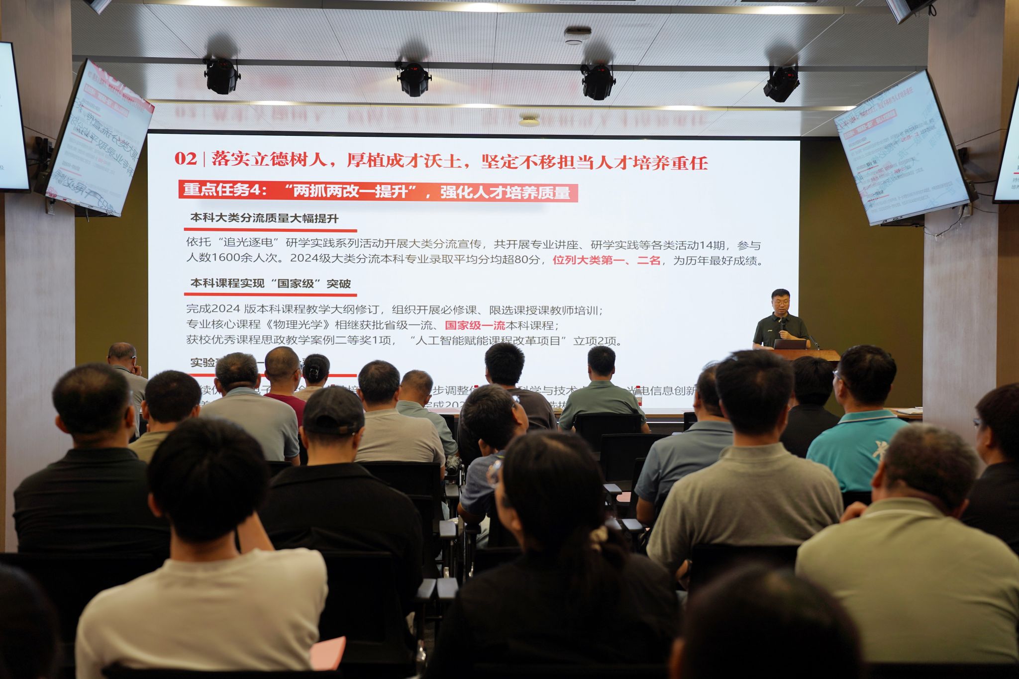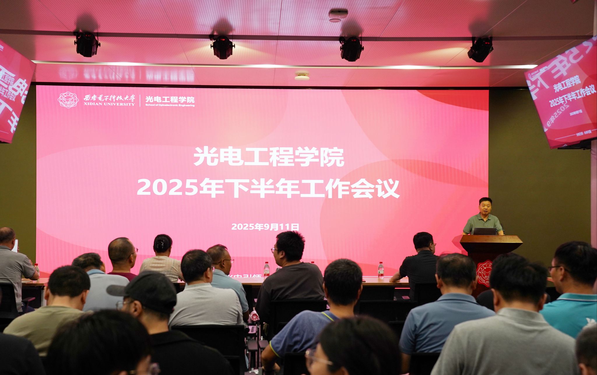 院长徐淮良代表领导班子回顾了学院上半年在党建工作、人才培养、学科建设、科学研究、管理服务等方面的工作情况,逐项对照分析了学院2025-2027年关键核心目标任务完成情况,并对下半年重点工作任务进行安排部署。他表示,全院上下要认真总结工作成效、积极校准目标任务、落实各项工作举措,为“十五五”事业发展和新一轮“双一流”建设持续凝聚光电智慧,贡献光电力量。