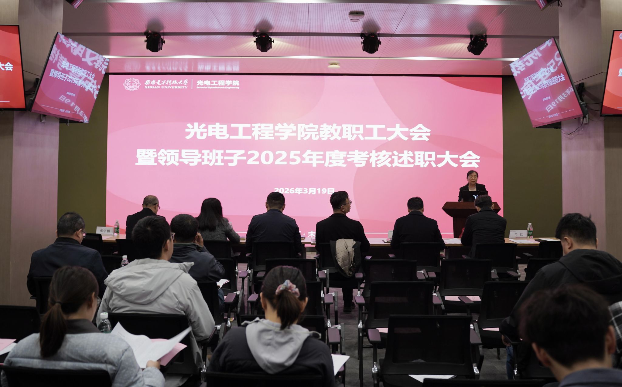 在雁塔校区会议中心104报告厅召开教职工大会暨领导班子2025年度考核述职大会。学院领导班子成员、全体教职工、学生代表及性爱视频