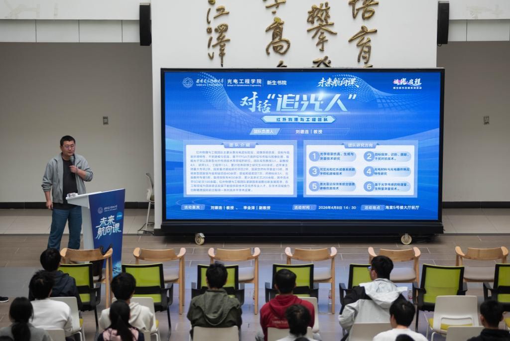 联合新生书院持续推进“追光·启程”系列活动——对话“追光人”。4 月8日下午,第二期“对话‘追光人’”在海棠 5 号楼大厅举行。红外物理与工程团队与近百名电子信息大类新生共探光电奥秘。
