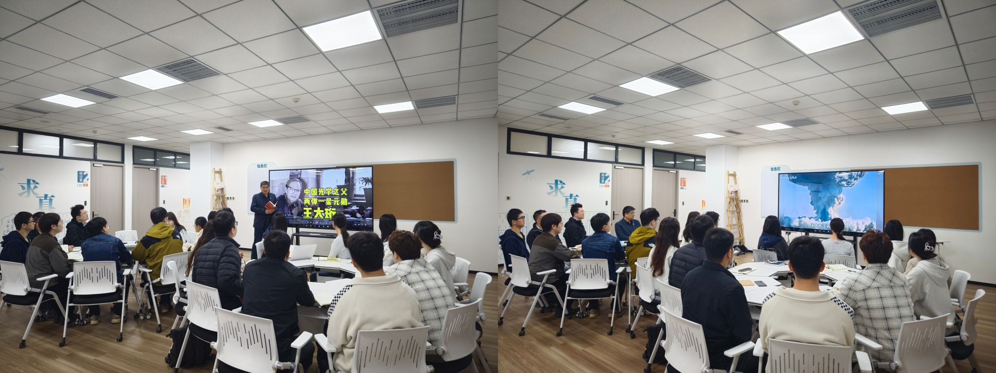 本次活动紧扣专业特色,师生共读《记忆里的两弹一星》,由党支部书记刘飞老师领学重点章节,他以书中王大珩院士等光电领域元勋的科研历程为切入点,结合光学工程学科的发展脉络,用实例阐述了“热爱祖国、无私奉献,自力更生、艰苦奋斗,大力协同、勇于登攀”的“两弹一星”精神内涵,勉励同学们以王大珩院士为榜样,将个人所学融入国家发展大局,在光电领域接续奋斗。随后,师生党员共同观看了纪录片《中国光学之父、两弹一星元勋—王大珩》。影像中,王大珩院士从放弃国外优厚待遇毅然归国,到白手起家创办中国科学院仪器馆、奠定新中国光学事业基础,再到为“两弹一星”工程研制大型光学观测设备呕心沥血的事迹,深深触动了在场的每一位光电学子。